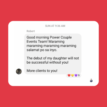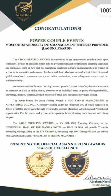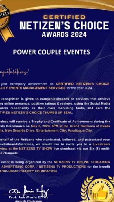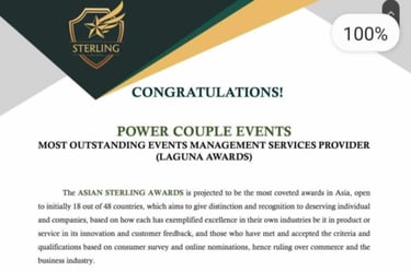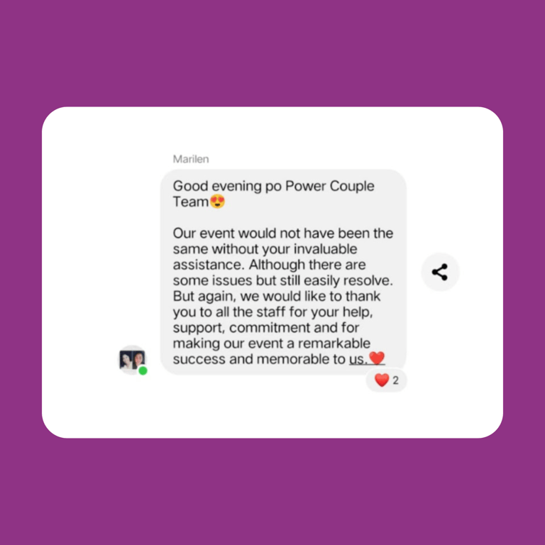 Kami ang Power Couple Events. We are making thousands of successful events, and we are trusted by celebrities and influencers. Featured on national TV. We are known to be one of the most trusted in the event industry dahil sa magaling na team, magandang decorations, masarap na pagkain, at quality service na siguradong abot kaya!