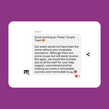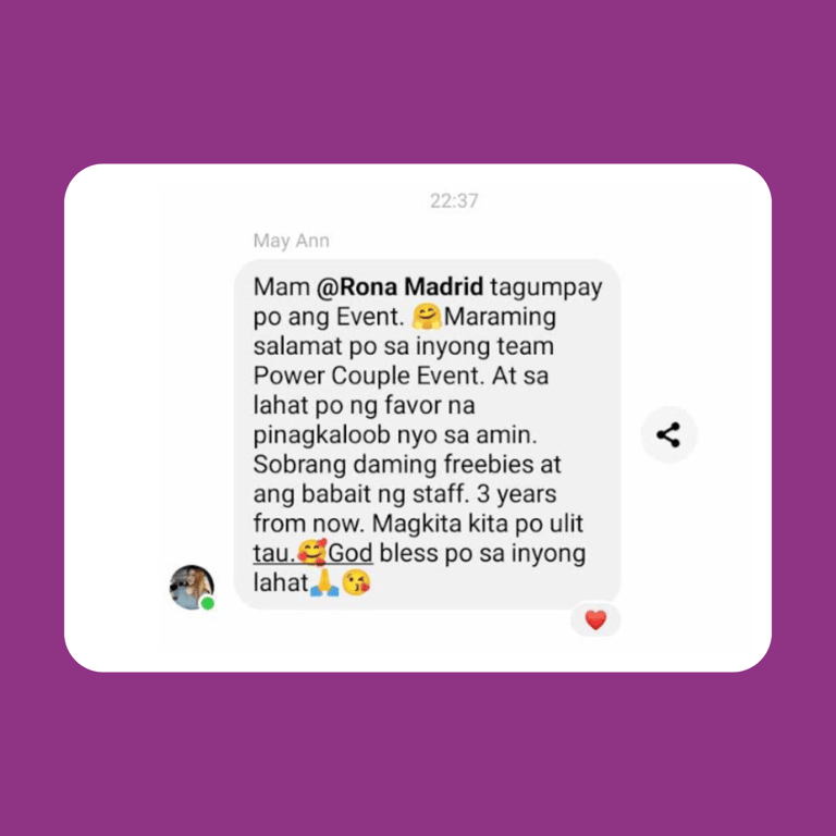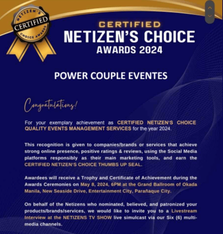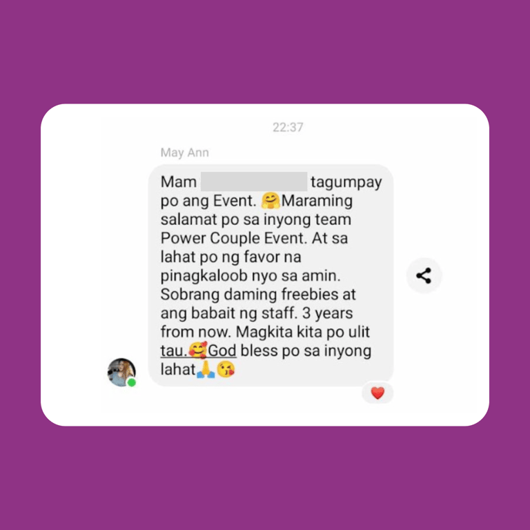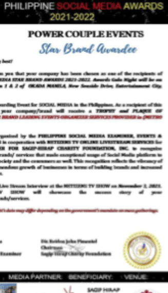 Power Couple Events is a LEGITIMATE company operating in the Philippines. We have many positive feedback and are well-known even by celebrities and influencers!