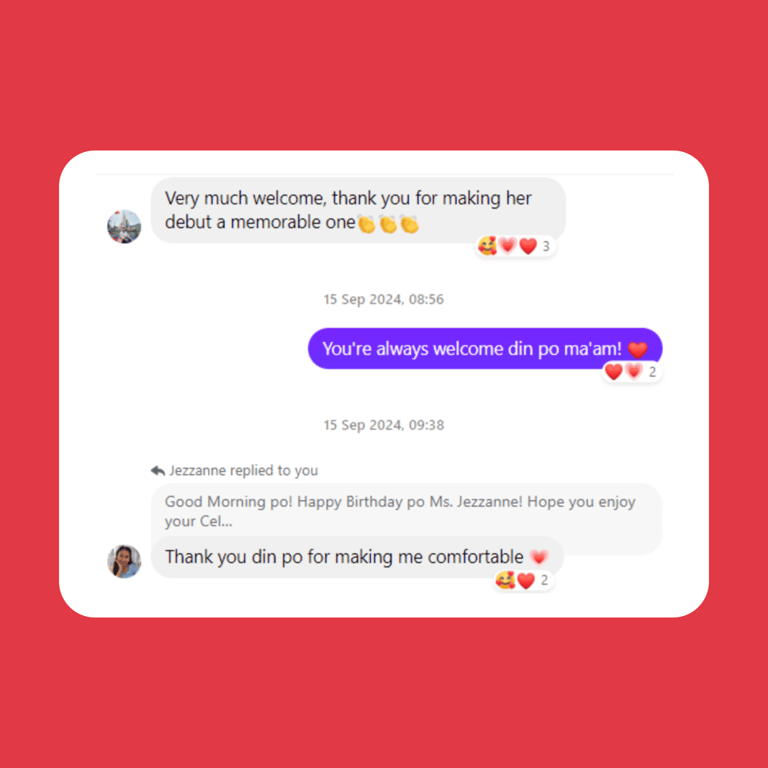 A beautiful, celebrity-approved event — without the stress, scam worries, or half‑million budget. Weddings. Debuts. Birthdays. Anniversaries. Any celebration. All‑in packages from ₱100,000 to ₱300,000. Serving Metro Manila, Cavite, Laguna, Batangas, Rizal, and Bulacan.