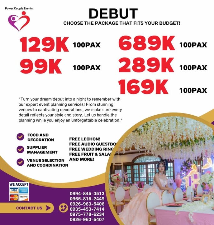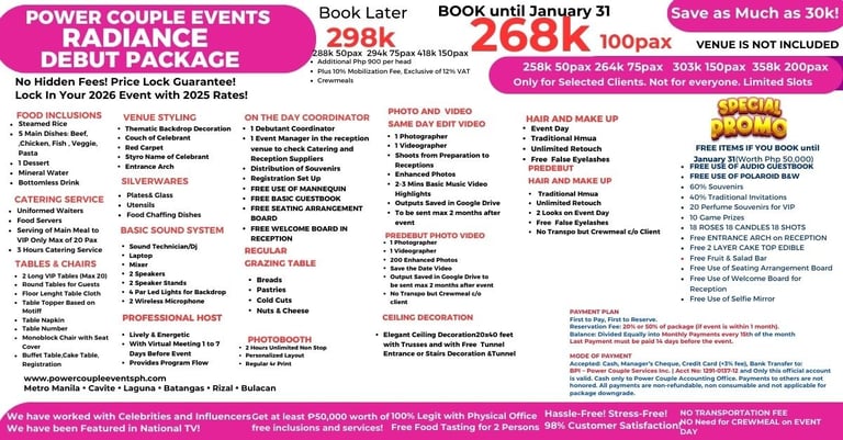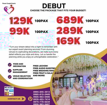 Kami ang Power Couple Events. We are making thousands of successful events, and we are trusted by celebrities and influencers. Featured on national TV. We are known to be one of the most trusted in the event industry dahil sa magaling na team, magandang decorations, masarap na pagkain, at quality service na siguradong abot kaya!