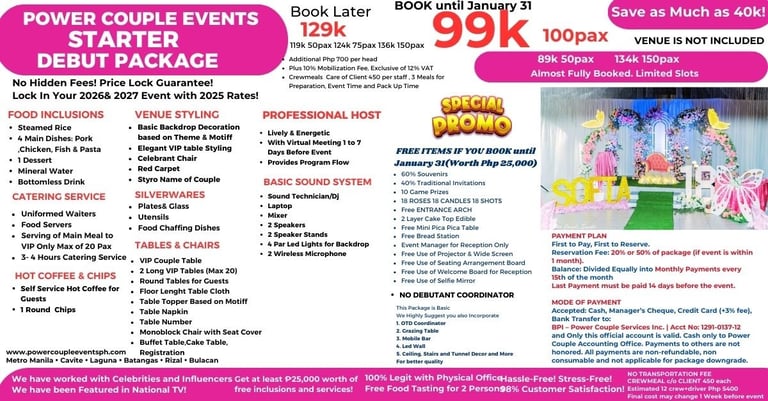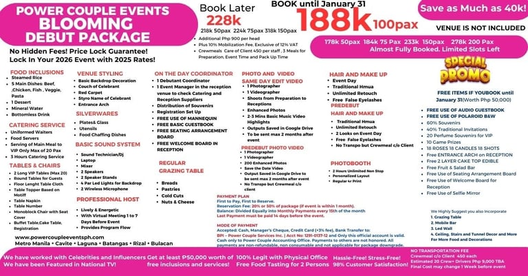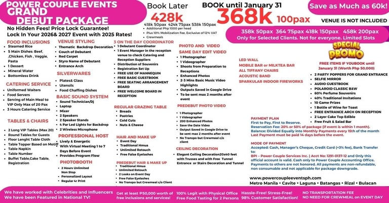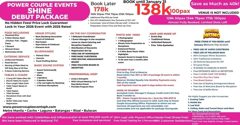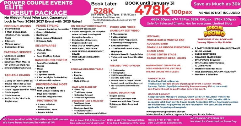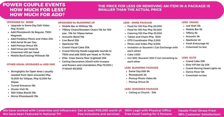 With many LEGIT HAPPY CLIENTS! Weekly Events na pwede mong i-visit! May physical office na pwede mong puntahan! Business documents! and well-trained team to handle your special moment!